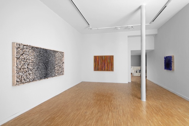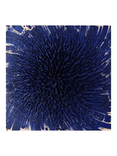 Kline’s medium of predilection is encaustic paint. This medium, an ancient painting technique consisting of pigmented wax, has been revived from time to time in the long history of its use, yet only a few artists of our generation, notably Jasper Johns and Brice Marden, have successfully used this medium repeatedly. Liquefied by heat, the encaustic is applied in layers that can never quite hide one another, each painting being thus a revelation of its own history. The encaustic is applied by the artist in a variety of ways. Sometimes the works are guided by gestural motions emanating from the movements of the body. Flinging paint onto the panel in all directions, such as in "Doppelganger" ou "Raskolnikov", establishes the basic form which is then developed further by brush strokes accumulating on these lines of thrown paint. Other times controlled strokes, stripes, dots, grids form the structure. Some works have relatively shallow depth such as in Newton’s Veil, other works incorporate a substantial build-up surface as in "New Blue Heart". Painted directly and spontaneously in numerous layers of paint they achieve with sensual dynamic intensity a tactility of surface that evokes textures found in nature.