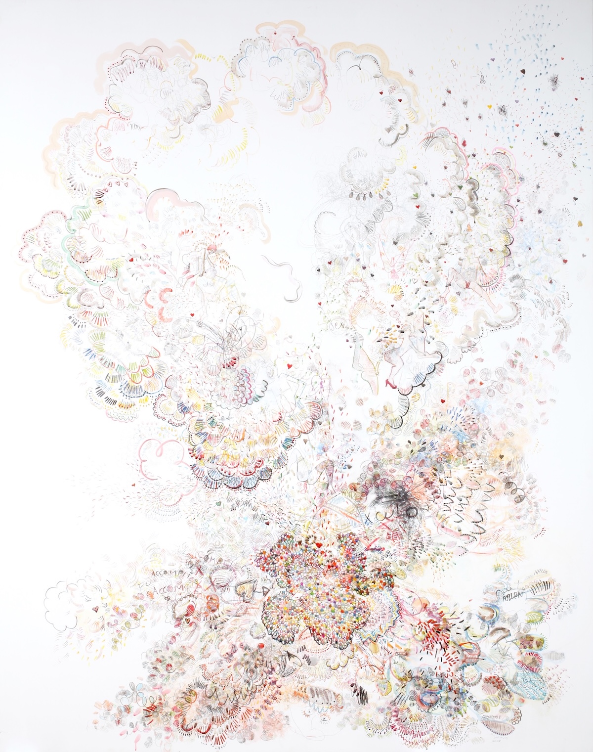 A collection of more than a hundred large drawings, crocheted pieces, videos as well as sewn papers integrating written texts, vouch for the artist’s fascination for the world of random connexions which roam in our brain and form thoughts and memory.